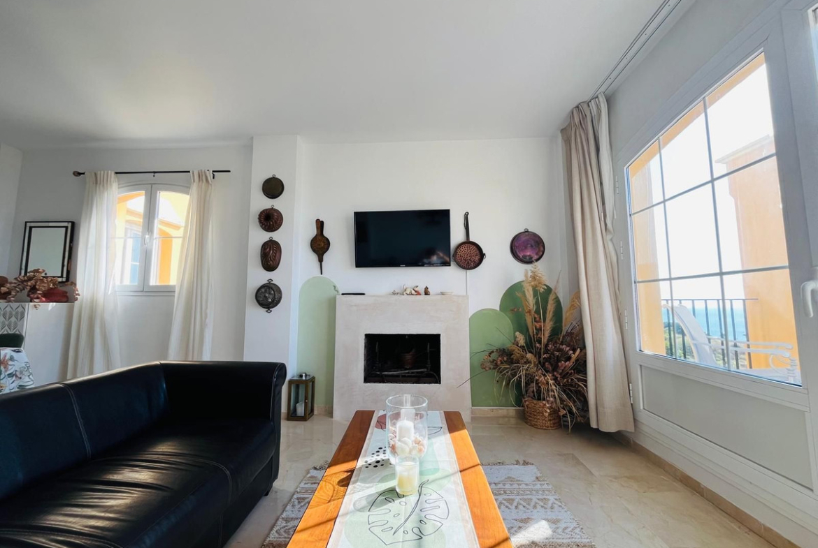 With a fully equipped closed kichen connected to a large shaded terrace for al fresco dining, as well as a dining area in the living room, this property never feels cramped. The living room is lovely – a worrking refurbished fireplace, a lovely large patio window/door bringing in the sea views, and a beautiful fron terrace to look out to sea.