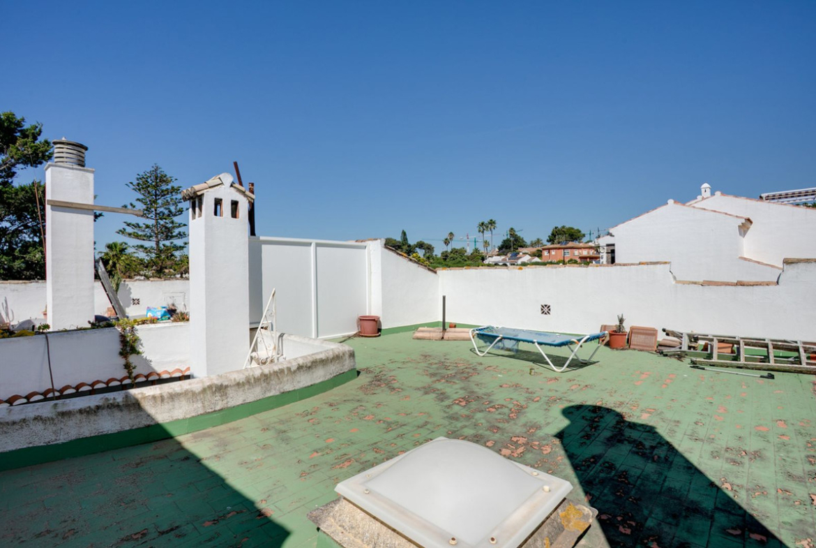 This property is located to the west of Estepona port and conveniently located close to shops and just a stones throw from the beach. The property has 2 double bedrooms which share the family bathroom, semi open kitchen and living room which open onto the balcony, from which you have great sea views. Off the kitchen is a small courtyard style terrace with stairs up to the roof terrace which is very large and here also is another room currently used as a storage room but can be converted into another room with access made from in the living room.