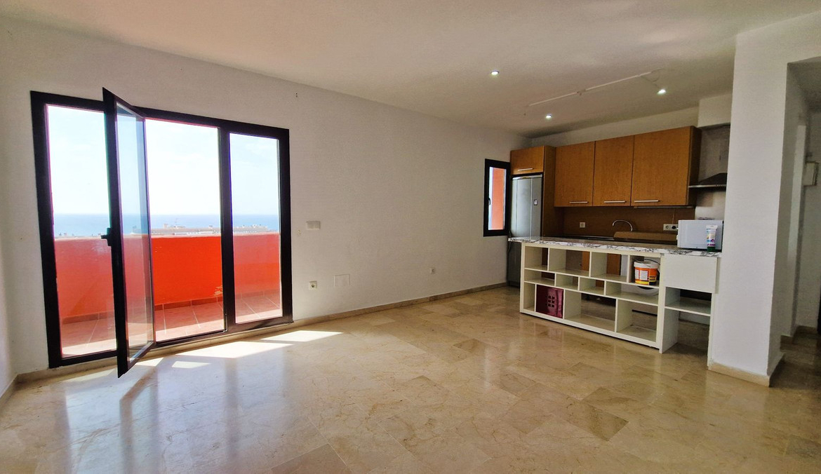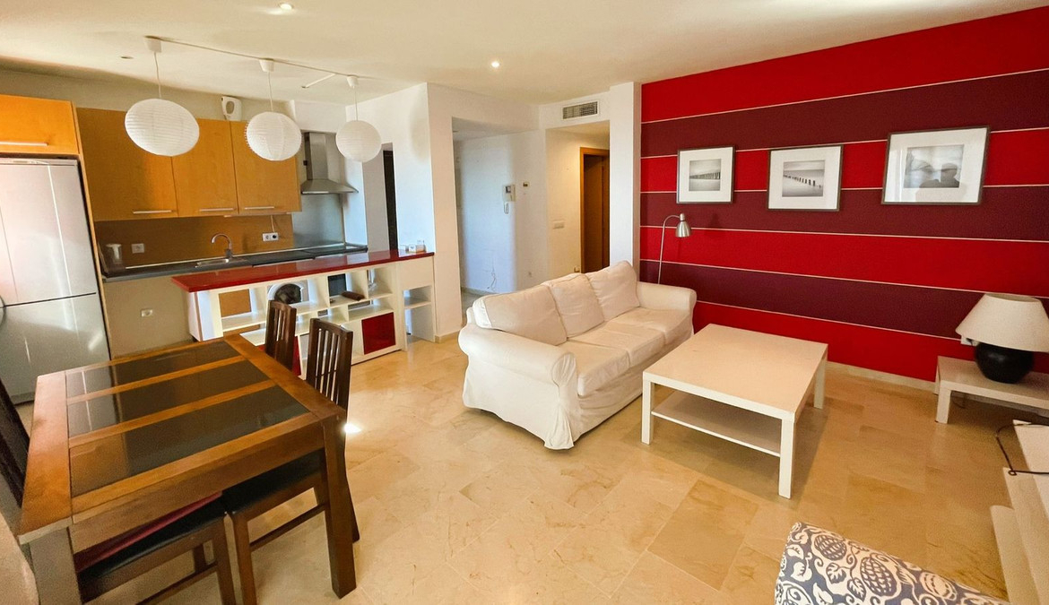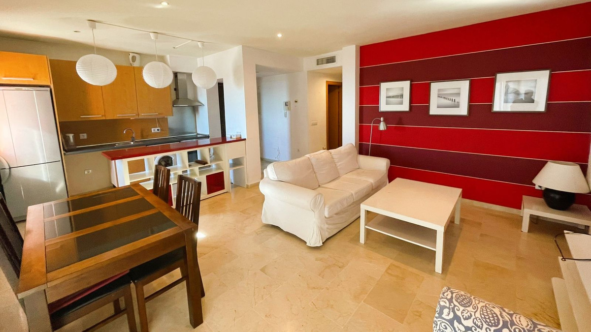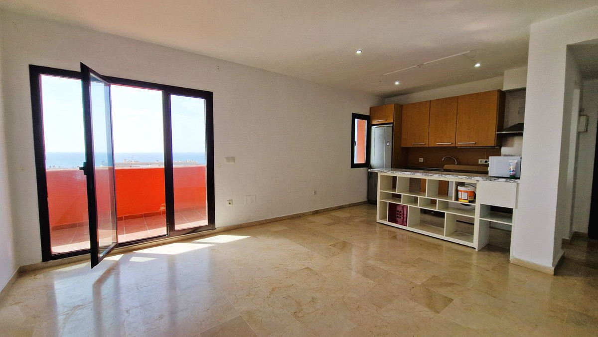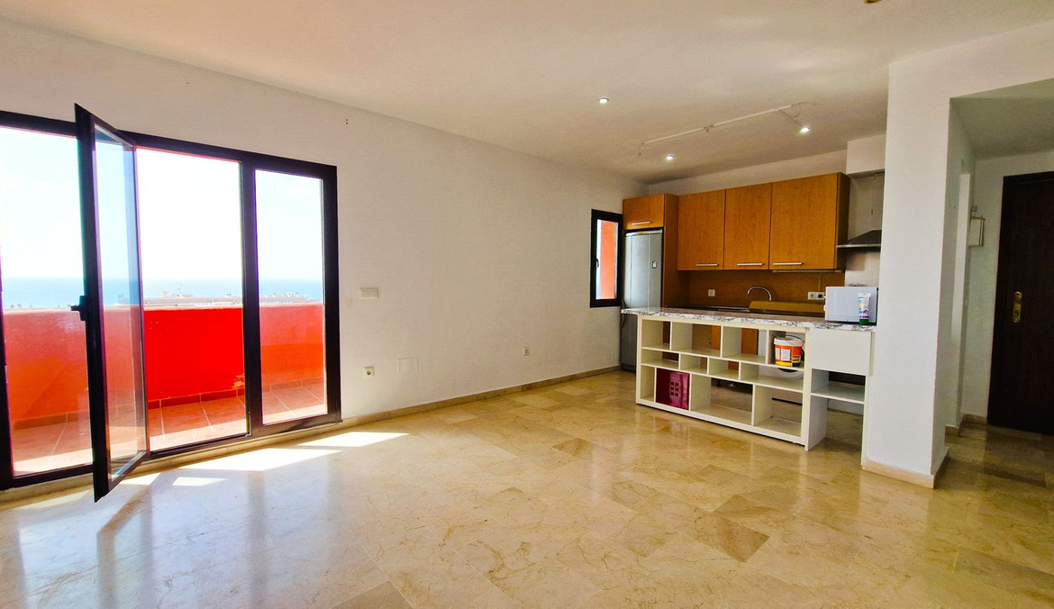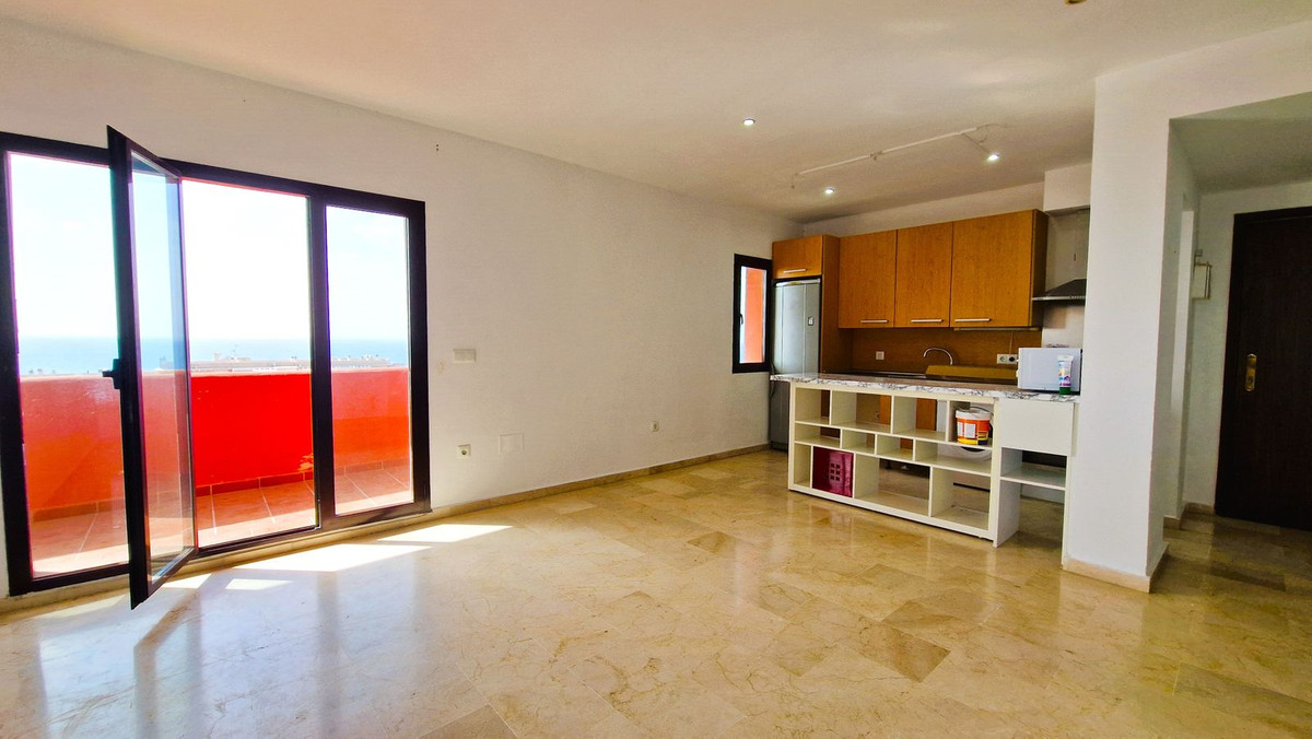 The open-plan kitchen is fully equipped and offers ample storage space, leading into the bright living-dining area with direct sea views.