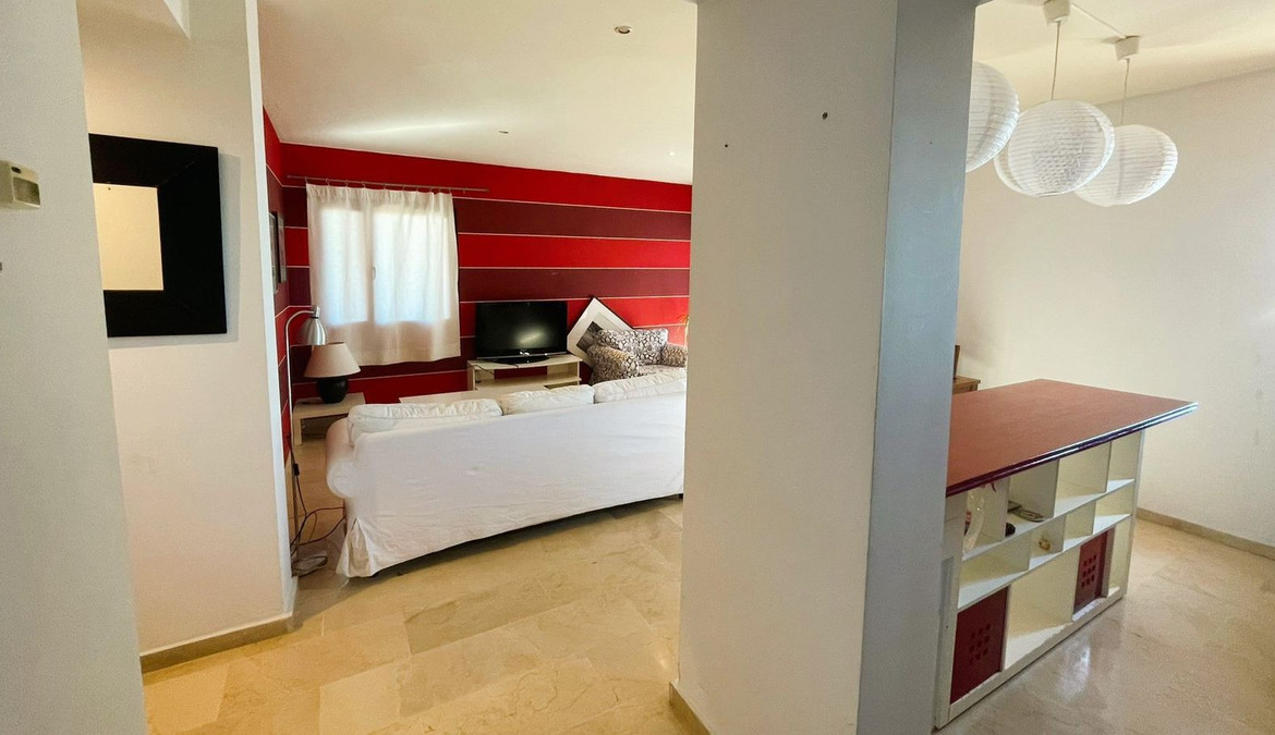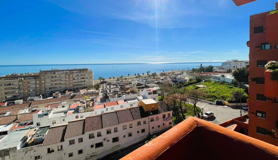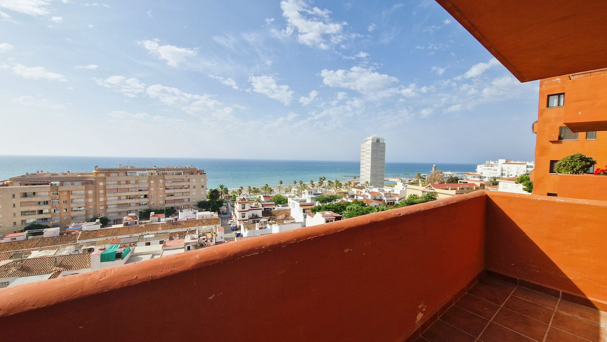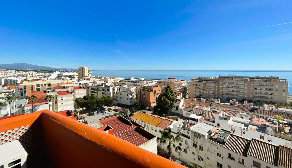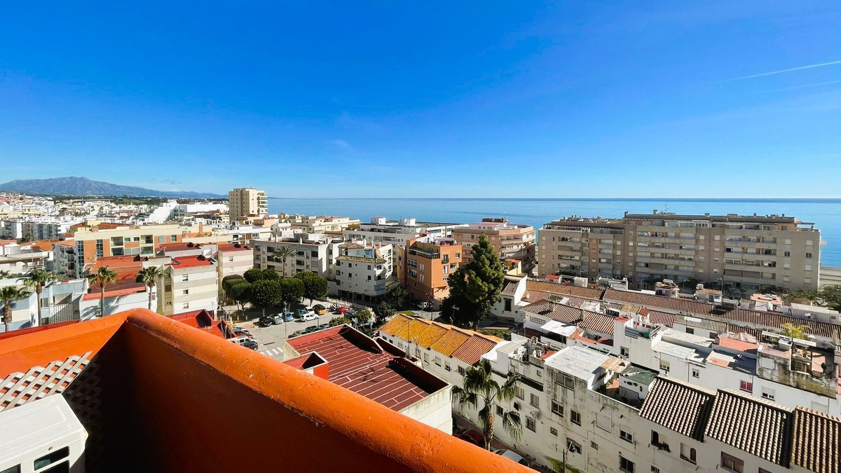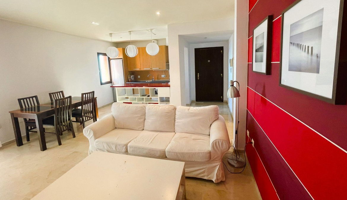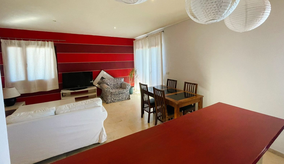 The open-plan kitchen is fully equipped and offers ample storage space, leading into the bright living-dining area with direct sea views.