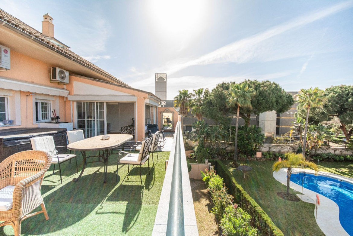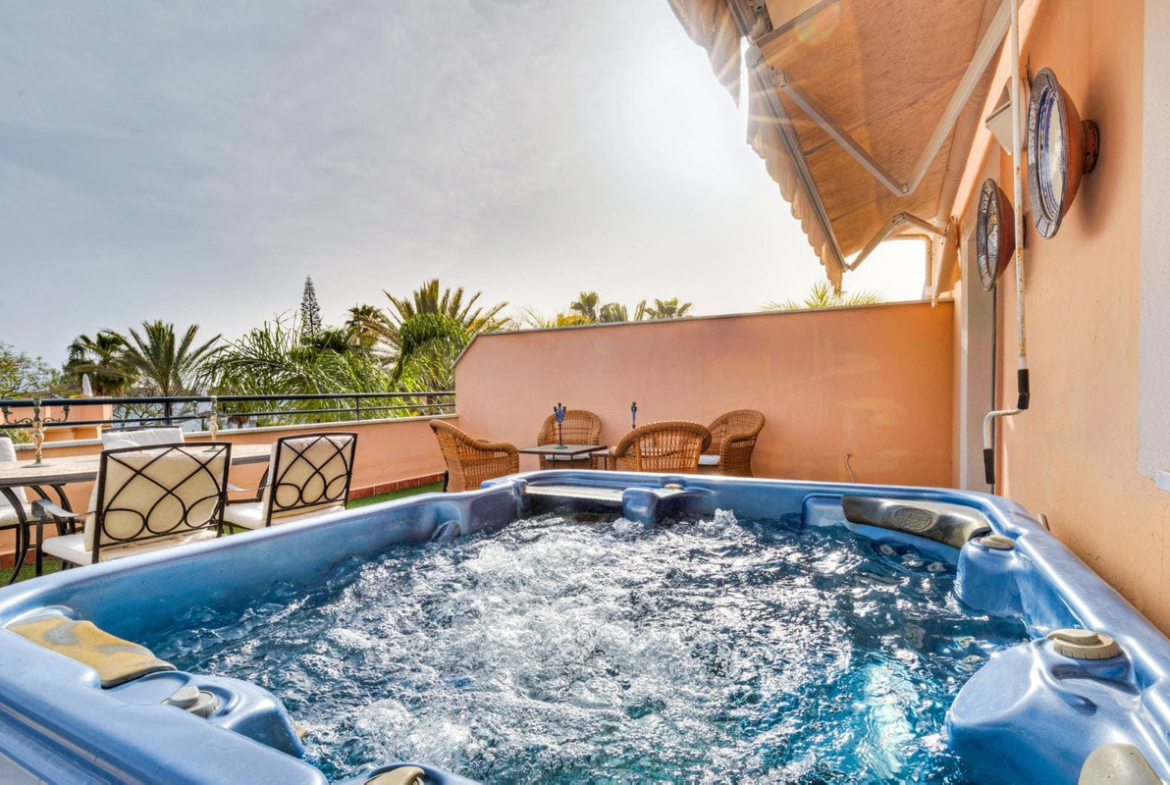 It has a huge terrace of 60 m2 facing south. The terrace has sun throughout the day and has a lot of privacy. There is also a Jacuzzi.